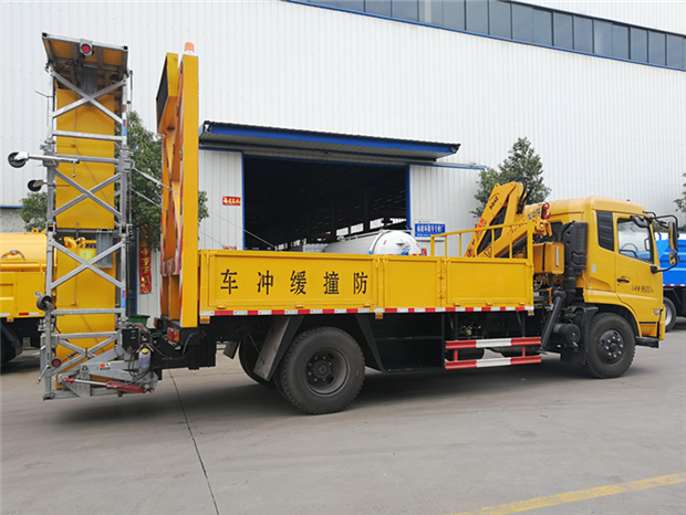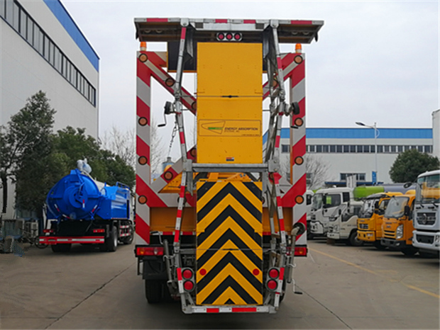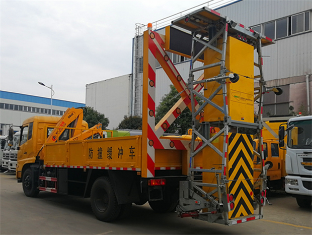 湖北程力東風天錦防撞緩沖車該車專用裝置為導向架和防撞緩沖墊等組成,可在臨時性車道封閉的路段給養路工人及設備提供全面的被動安裝防護:通過防撞包的變形均勻逐漸的緩消碰撞的動能,對施工人員及設備進行有效的保護,同時最大限度地保護撞擊車輛內人員的安全。