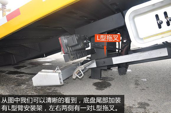 從圖中我們可以清晰的看到,底盤尾部加裝有L型臂安裝架,左右兩側有一對L型拖叉,其作用主要是托舉車輛時,能抱緊輪胎,防止輪胎滑落。