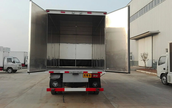 2、廂體分為兩部分:A:運輸炸藥;B:運輸雷管(防爆罐防爆箱);C:炸藥,雷管同時運輸(廂體必須隔倉,分倉運輸,加裝防爆罐防爆箱)。廂體為雙層金屬骨架結構,外部為冷扎鋼板,內壁采用鋁合金板蒙面,夾層為隔熱阻燃材料填充。設置對開門,如需安裝抗暴容器則增開側門,側壁設有防雨功能自然通風窗口,以使廂內外空氣流動,廂體內部做防靜電處理,廂體底部與廂內前部鋪有阻燃導靜電膠板,并與底盤等電位連接,通過車輛后端的導靜電裝置與大地相連,可防止靜電火花的產生和車輛靜電及時釋放,提高爆破器材運輸車的安全性。廂體內部前面和側面裝有固定拉環,與捆綁帶使用捆綁貨物以避免移動,保證安全。